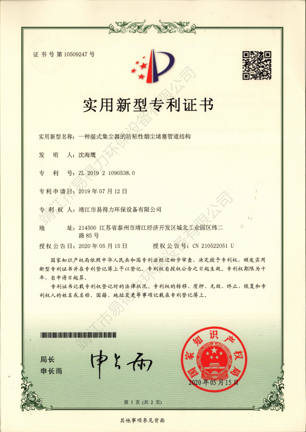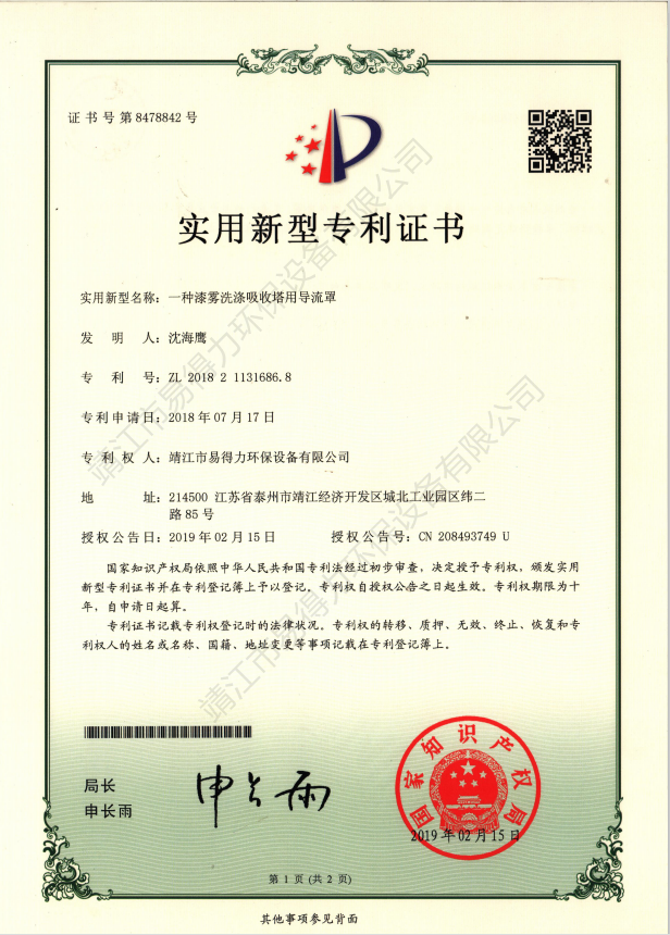 專利證書本公司坐落于開放開發(fā)超前城市江蘇靖江,我們精良優(yōu)秀設計團隊始終遵循著創(chuàng)新超越的理念,贏得了中外合資企業(yè)的信賴。易得力環(huán)保設備有限公司與上海環(huán)科院等科研單位保持合作關系,不斷加大自身的科研力量,集中了一批國內(nèi)環(huán)境科技研究和應用方面的高素質(zhì)人才,取得多項實用新型專利證書。…… 查看更多 >>